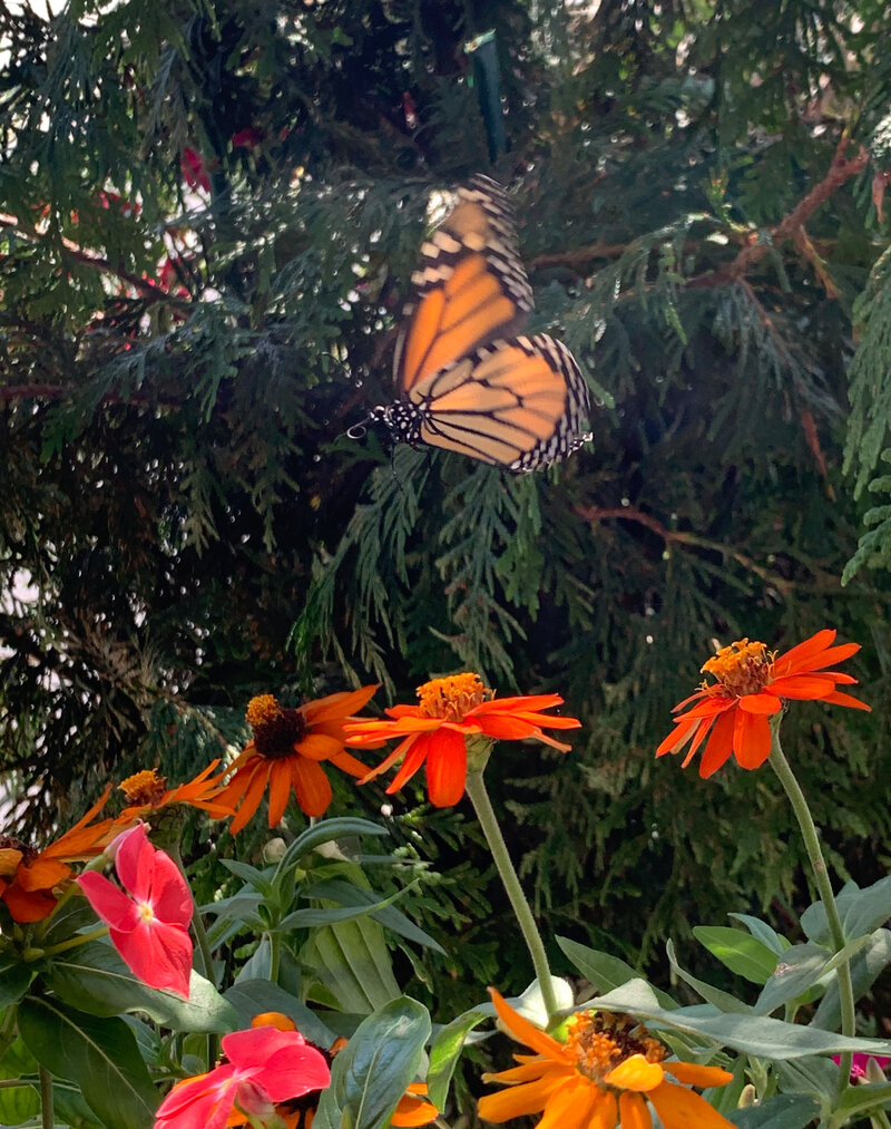 Outside courtyard featuring diners in a floral setting